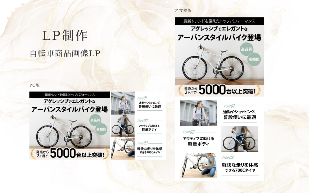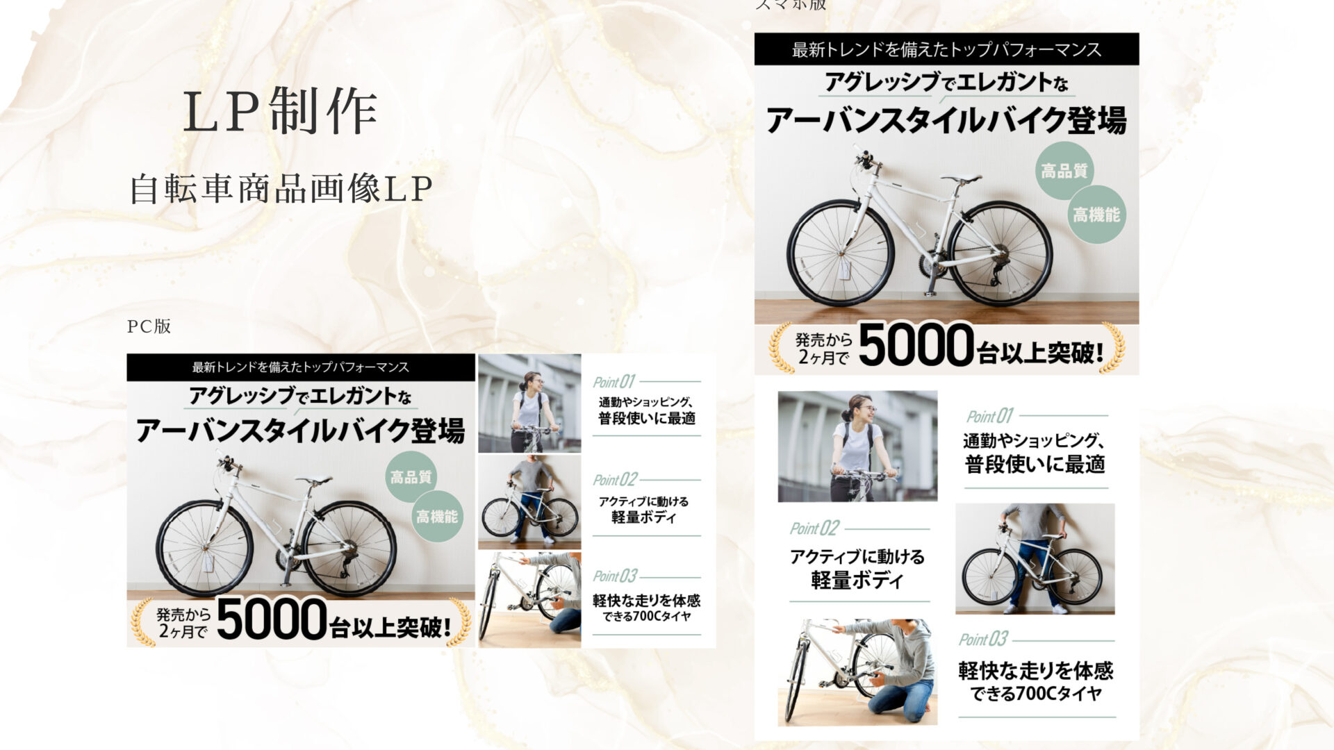 - PC版とスマホ版の最適化: それぞれの画面サイズに合わせたレイアウトで、商品写真、コピー、3つのポイントを配置しており、レスポンシブ対応を意識したデザインです。