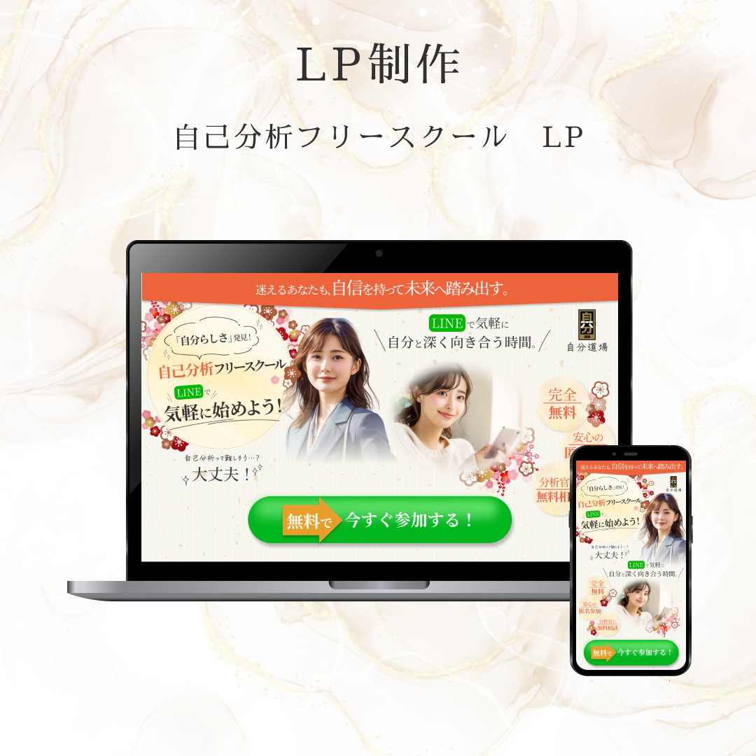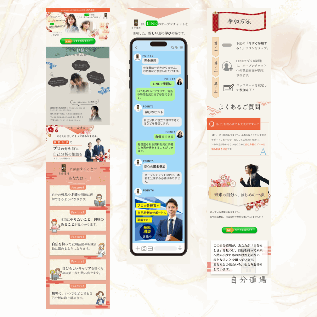 - Feature1〜4: 自分への理解が深まる、自信が持てるようになる、自分らしい生き方が見つかる、といった具体的なベネフィットをイラスト付きで分かりやすく紹介。
