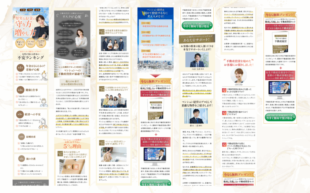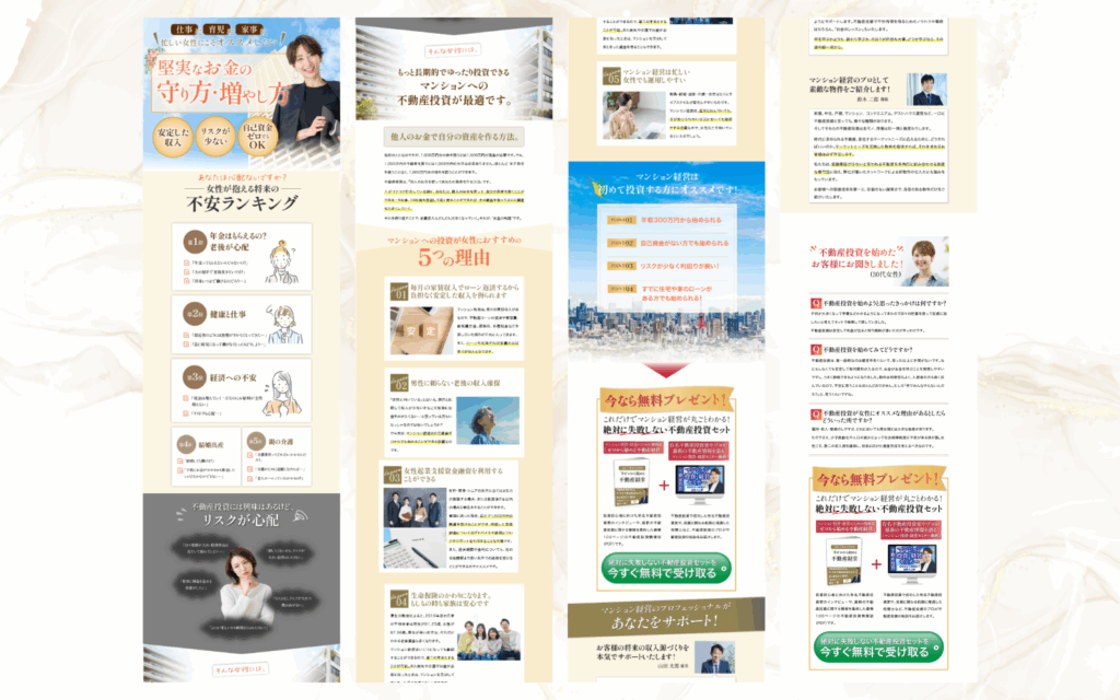 • お客様の体験談: 実際に不動産投資を始めた女性の体験談を掲載し、再現性と成功イメージを具体的に示しています。