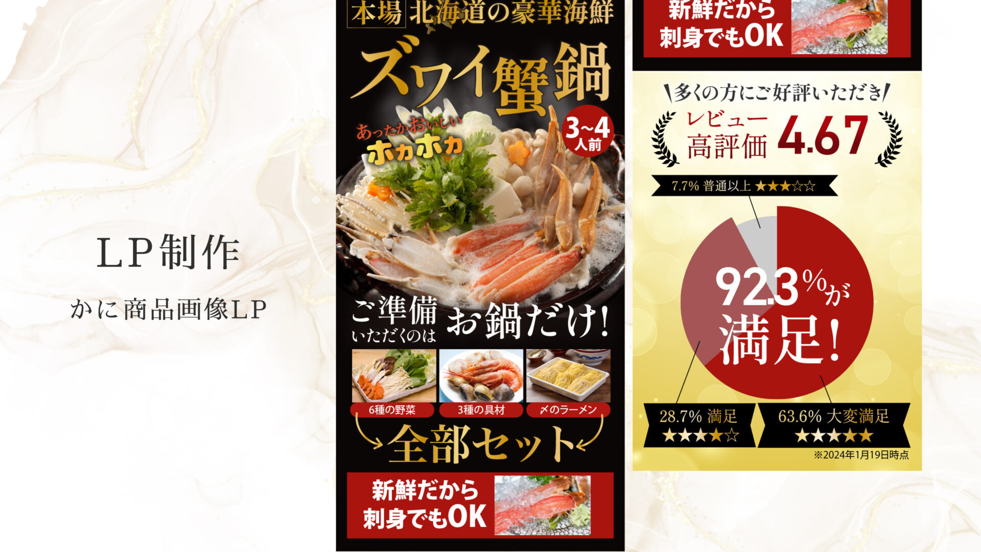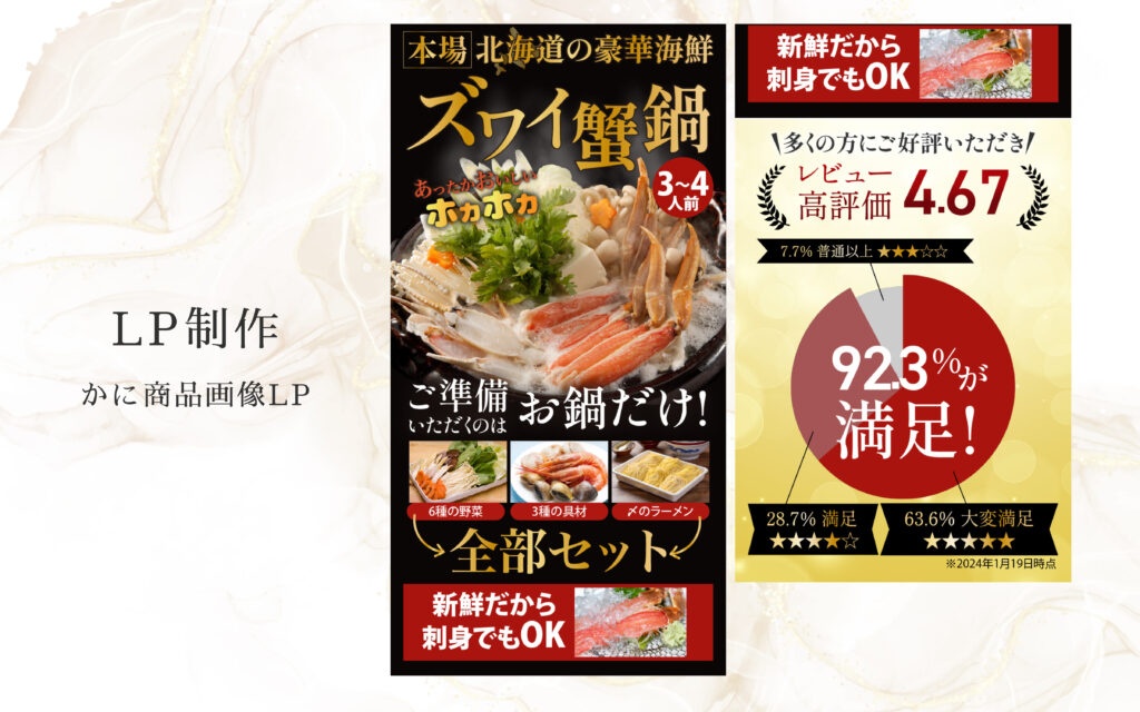• 鮮度の強調: 「新鮮だから刺身でもOK」というコピーとともに、カニ刺し(またはそれに使えるカニ)の写真を配置し、商品の鮮度の高さを強力にアピールしています。