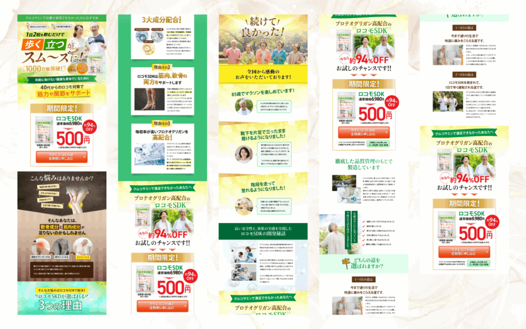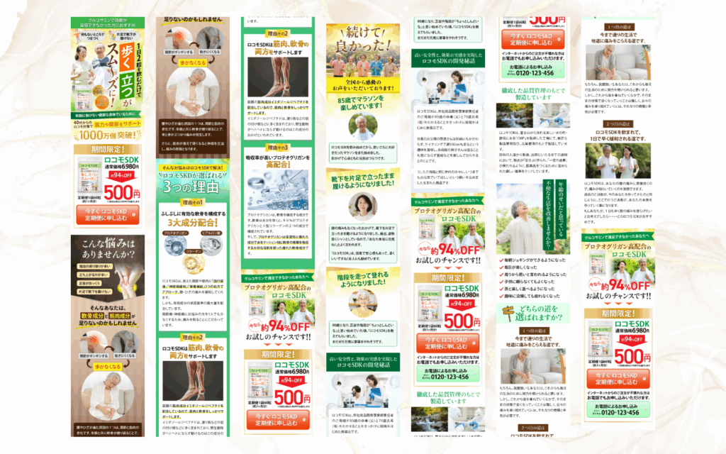 - ペインポイント: 「こんな悩みはありませんか?」で、「階段の上り下りがつらい」「すぐに足腰が弱くなったと感じる」など、ターゲットの日常の悩みを具体的に列挙し、共感を深めています。