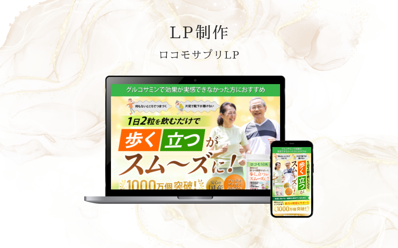 - メリットの強調: 「1日2粒を飲むだけで、歩く立つがスムーズに!」と、具体的な行動(歩行・立ち上がり)の改善という最大のメリットを、明るい笑顔のモデル写真とともに示し、未来の希望を表現しています。